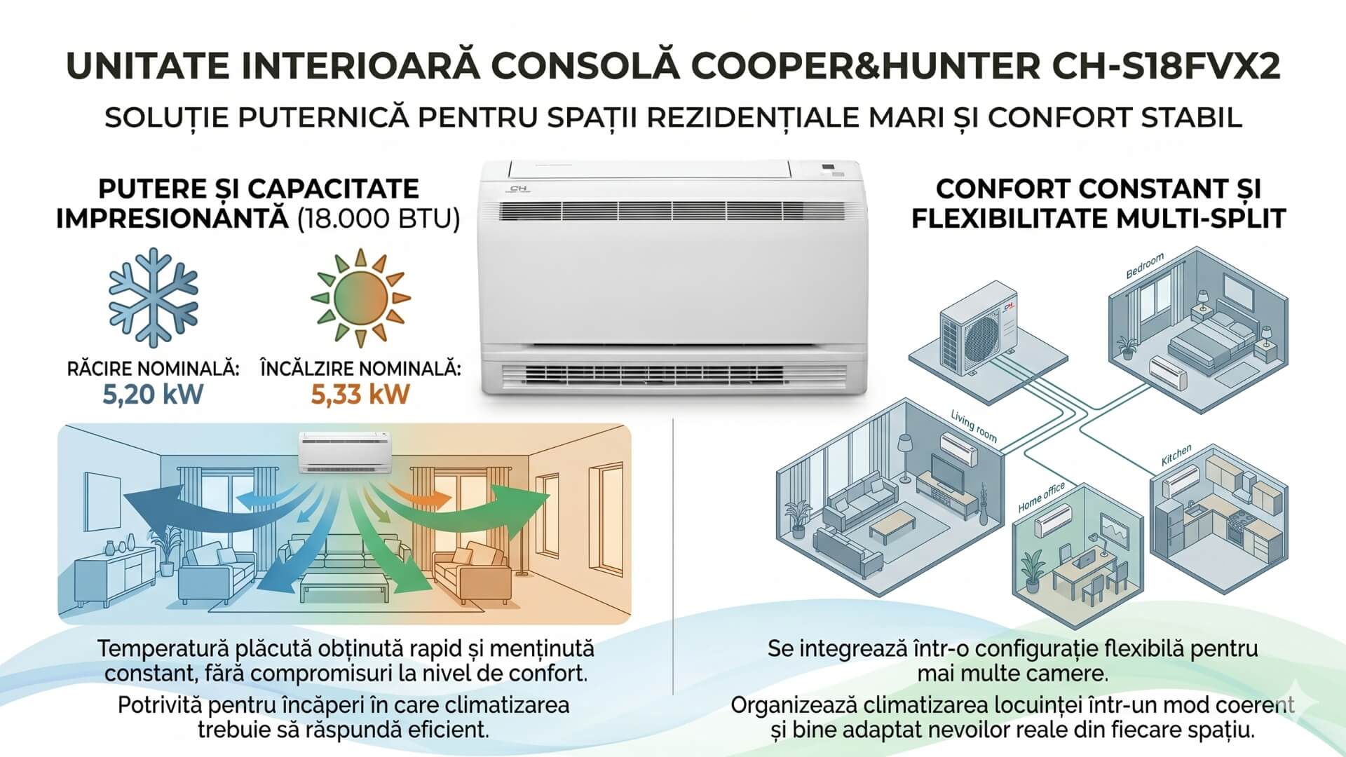 Cooper&Hunter Consola CHML-IK18FVX(I) este o unitate interioară rezidențială multi-split, tip consolă, concepută pentru proiectele în care climatizarea trebuie să rămână eficientă, dar și ușor de integrat în spațiu. Formatul său compact și proporțiile specifice tipului consolă o recomandă pentru încăperi în care poziționarea joasă a unității este mai potrivită decât montajul mural clasic.