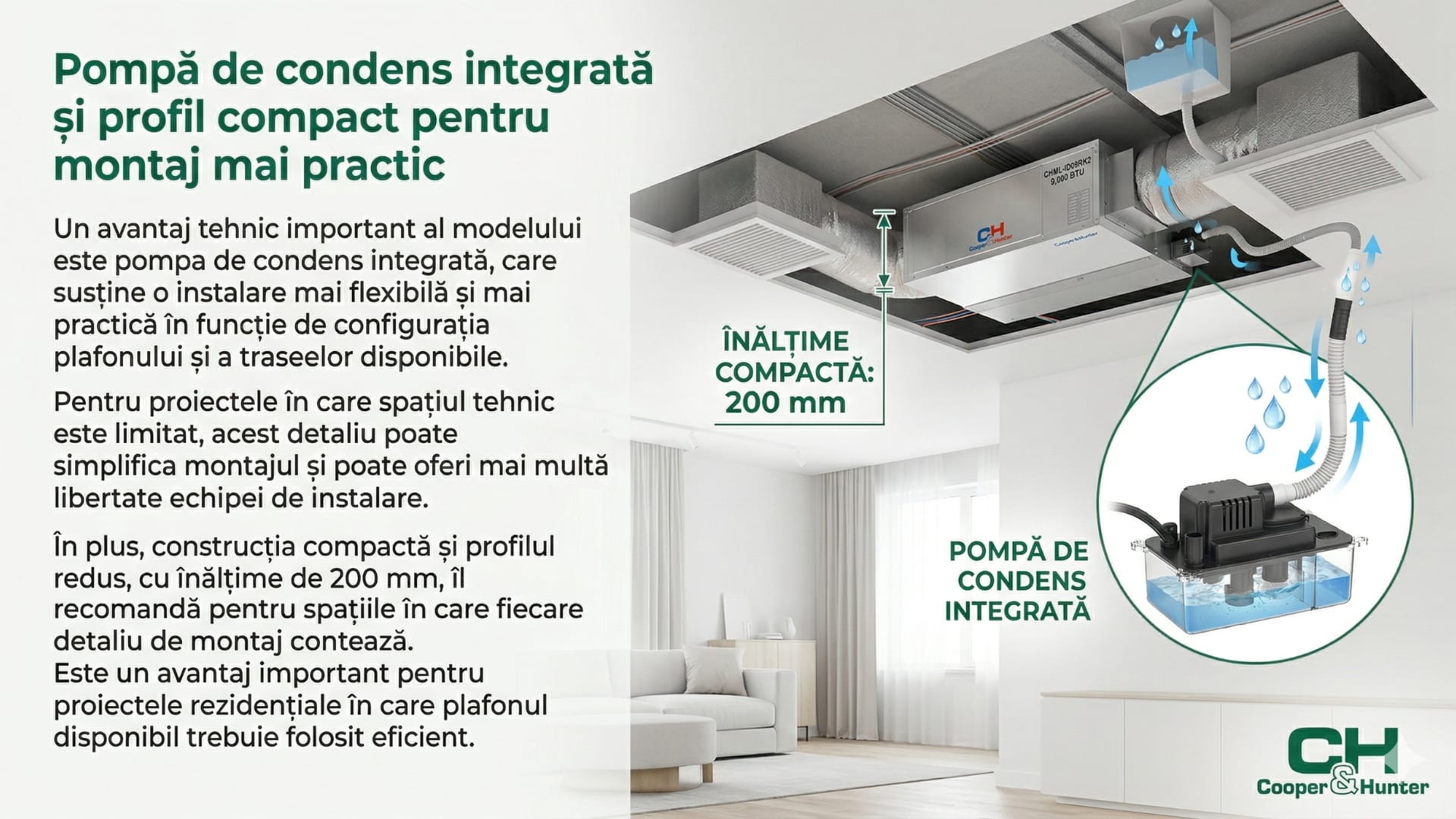 Un avantaj tehnic important al modelului este pompa de condens integrată, care susține o instalare mai flexibilă și mai practică în funcție de configurația plafonului și a traseelor disponibile. Pentru proiectele în care spațiul tehnic este limitat, acest detaliu poate simplifica montajul și poate oferi mai multă libertate echipei de instalare.